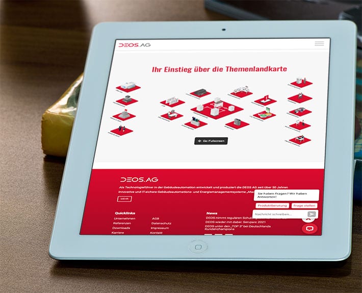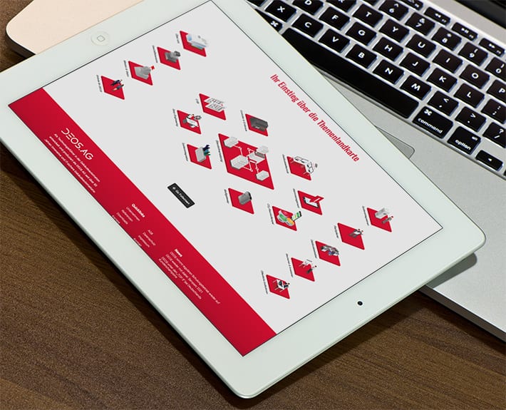 In Zusammenarbeit entstand außerdem die Themenlandkarte, über die ebenfalls in die 360° Tour eingestiegen werden kann. Die Karte bietet einen Überblick aller Arbeitsbereiche der DEOS AG, welche vom Interessenten durch entsprechende Icons schnell erfasst werden können.