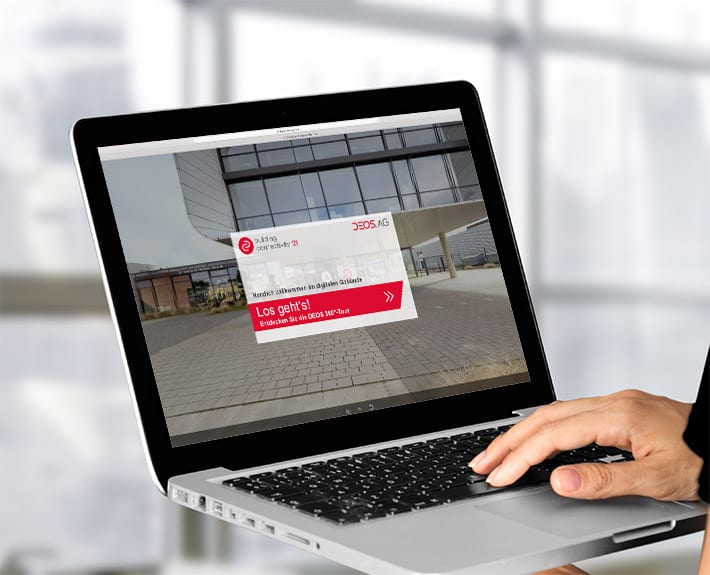 Der Kunde DEOS AG wünschet sich eine 360°-Tour des Firmensitzes, um Interessenten mehr Infos über die DEOS AG als Unternehmen, die Geschäftsbereiche, Alleinstellungsmerkmale und Zukunftsvision zeigen zu können. Produkte und Lösungen sollten außerdem live im Einsatz präsentiert werden. Kundenwunsch war zusätzlich die Möglichkeit möglichst viele verschiedene Inhaltstypen wie Texte, Bilder, Dateien und Videos einbauen zu können.