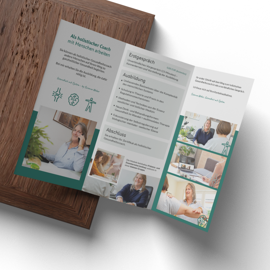 Unsere Kundin Susanne Weber ist seit 25 Jahren im Bereich der ganzheitlichen Gesundheit als holistischer Gesundheitscoach und TCM-Therapeutin tätig. Sie bietet ihren Kunden eine Vielzahl von Behandlungsmöglichkeiten auf Basis moderner Ansätze aus Physiologie, Neurobiologie und Sozialpsychologie an. Nachdem wir für Susanne Weber bereits eine neue Webseite erstellt haben, beauftragte sie zusätzlich auch ein Flyer-Konzept, welches ihre Angebote und Werteversprechen auch in einem Printmedium klar und ansprechend präsentieren sollte.