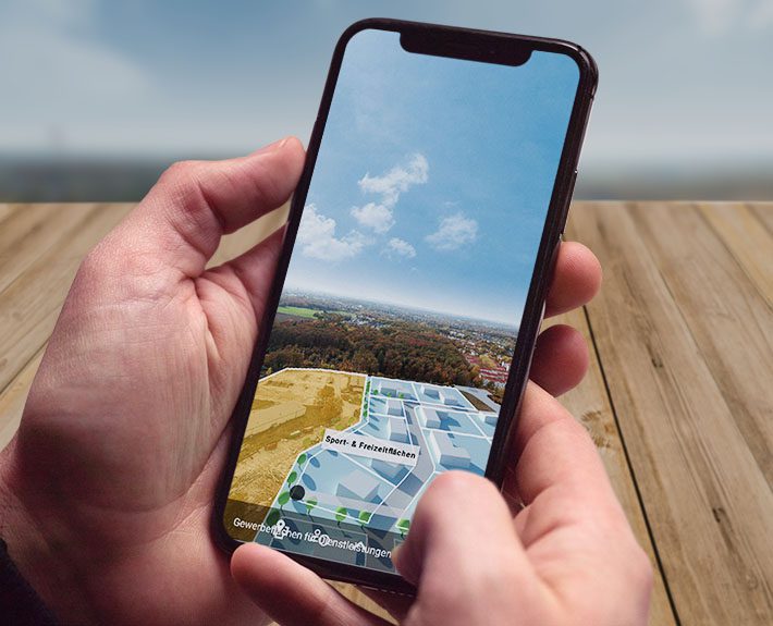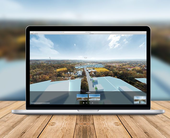 Zur Umsetzung haben wir zwei 360° Luftaufnahmen mit einer Drohne aus 100 m Höhe aufgenommen und mit Hilfe unserer GIS-Software zu einer virtuellen Tour zusammengesetzt. Anschließend haben wir die Tour mit Hotspots und Informationen versehen. Als Highlight wurde eine zweite Ebene mit einem 3D Modell des Planungsstandes eingebaut. Nun kann durch einen Schieberegler der Ist- und Planzustand virtuell erkundet werden.