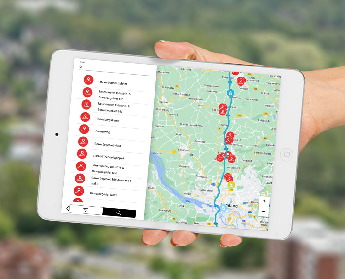 Für die Gewerbegebiete Neumünster Bootstedterstr., Industriegebiet Süd und Technologiepark, sowie die Gewerbegebiete des Nordgates Bad Bramstedt, Henstedt-Ulzburg, Kaltenkirchen, Frederikspark, Nordport und Quickborn sollte zusätzlich zu den 360° Touren, eine interaktive Karte als Überblick entstehen.