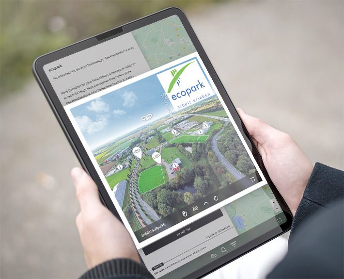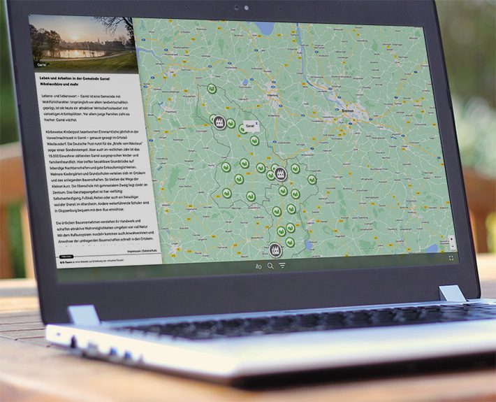 Auf der interaktiven Karte haben wir zunächst alle 23 Städte und Gemeinden des Oldenburger Münsterlandes angelegt und anschließend die Gewerbegebiete als Infopunkte gesetzt. Bei einem Klick auf das jeweilige Icon erhält der Interessent sämtliche Infos und Bilder des jeweiligen Gebiets oder der Stadt/Gemeinde.