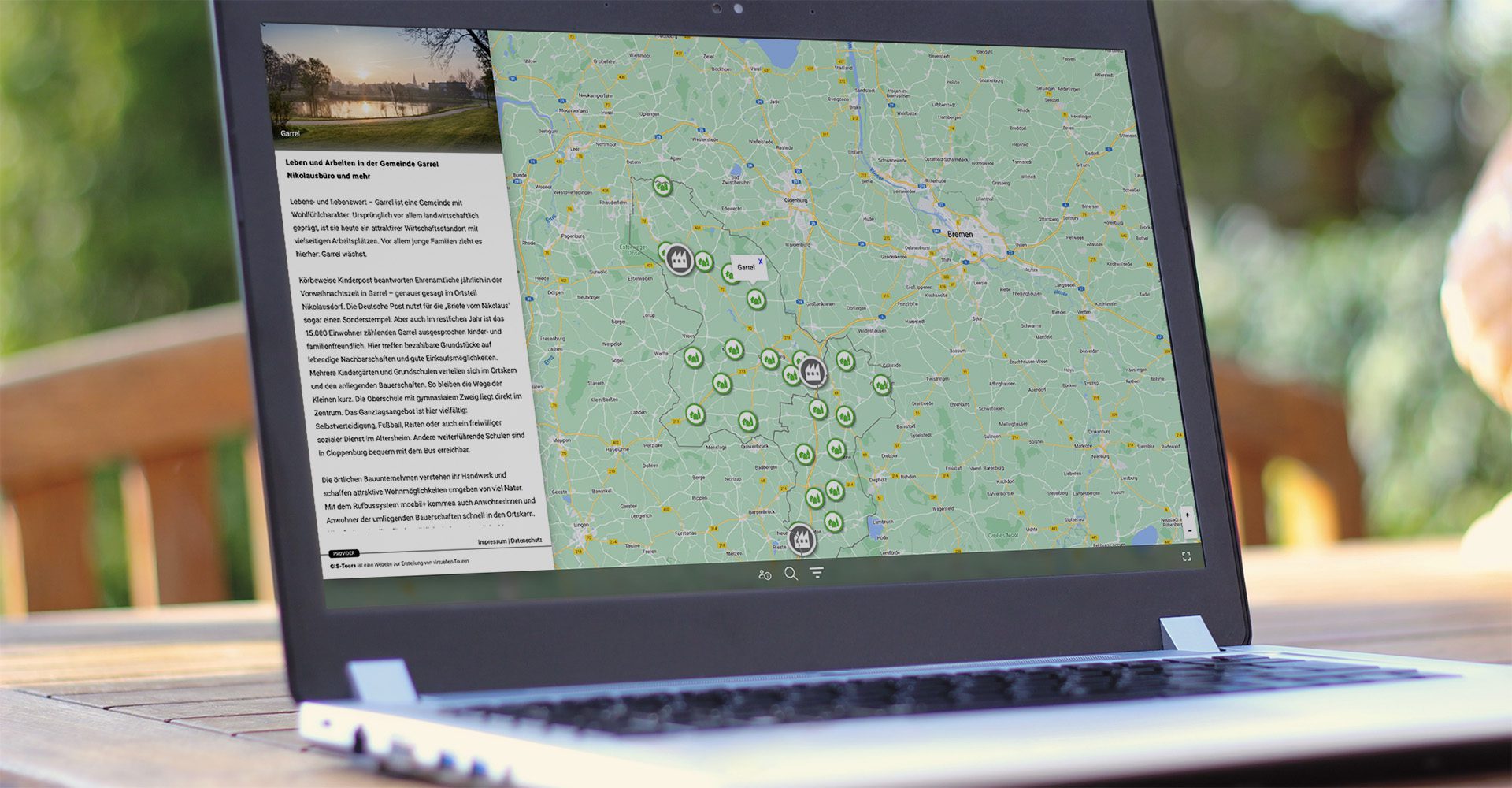 Unabhängig von einzelnen 360°-Touren für die jeweiligen Städte und Gemeinden, sollte ein gemeinsamer Auftritt für die Region Oldenburger Münsterland für eine Messe geschaffen werden. Dieser sollte sowohl über die Gewerbegebiete, aber vor allem auch über die Städte und Gemeinden selbst informieren. Hier hat sich der Verbund Oldenburger Münsterland e.V. für unsere interaktive Karte entschieden.
