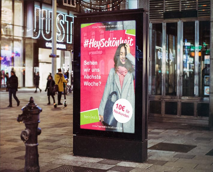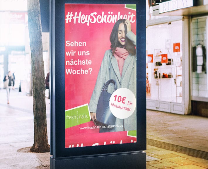freshnails wünschte sich eine auffällige Außenwerbung. Diese sollte nicht nur tagsüber, sondern vor allem auch abends wahrgenommen werden, da die Zielgruppe zu dem Zeitpunkt in der Stadt unterwegs ist.