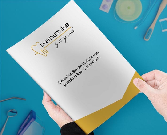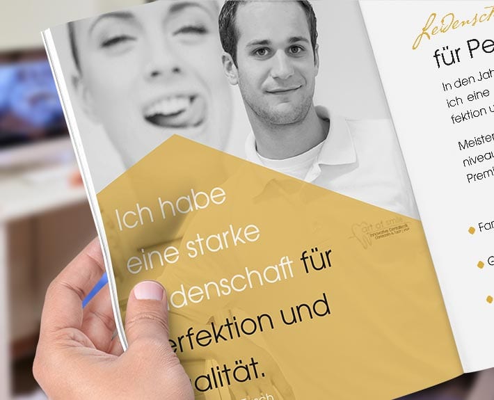 Der Kunde wünschte sich eine Broschüre, um explizit Kunden für seine Premium-Linie anzuwerben. Viele Patienten wissen nicht, dass Sie sich für Ihren Zahnersatz beim Zahnarzt, das Dentallabor Ihrer Wahl aussuchen können. Darauf möchte art of smile in diesem Flyer noch einmal hinweisen und seine Kompetenzen zeigen.