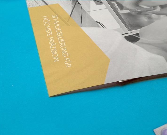 Nachdem sich der Kunde für einen unserer Entwürfe entschieden hat, wurde der Druck mit einem unserer Partner abgewickelt. Als besonderes Extra entschied sich der Kunde beim Druck für eine Veredelung durch eine goldene Heißfolienprägung auf der Titelseite. Diese lässt die Broschüre edel und hochwertig wirken.