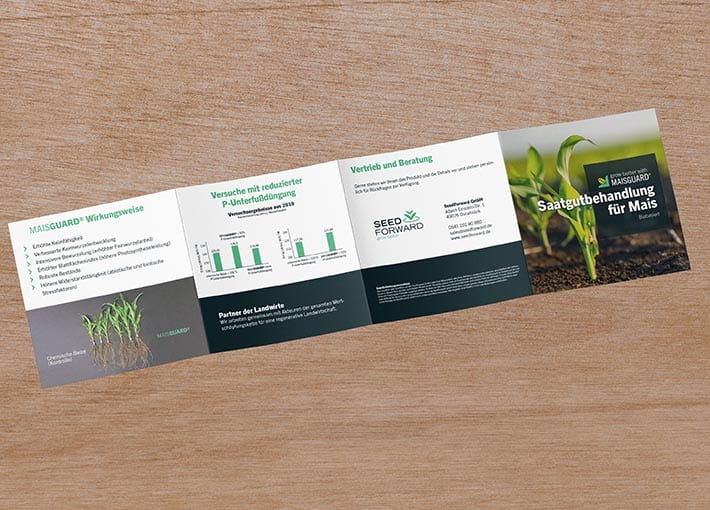 Um den potentiellen Kunden das Produkt näher zu bringen, gilt die Aufmerksamkeit auf dem Cover des Flyers ganz dem Produkt. Eine Maispflanze in Kombination mit „MAISGUARD – Saatgutbehandlung für Mais“ macht deutlich, worum es geht. Im Innenteil des Flyers werden die Vorteile von MAISGUARD und der Nutzen für den Landwirt kurz vorgestellt.