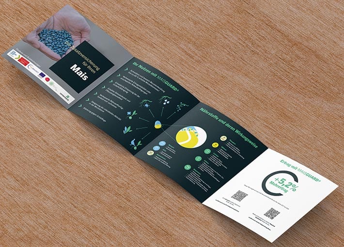 Diagramme von Versuchsergebnissen untermauern die Wirksamkeit, die Ertragssteigerung durch MAISGUARD wird anhand konkreter Beispiele bewiesen und die Wirkungsweise an Echtbildern der Pflanzen demonstriert. Alle relevanten Infos sind in einem Printmedien gebündelt und leisten Überzeugungsarbeit. Gleichzeitig wird mittels QR Code ein Übertrag zur Webseite, für weitere Informationen, geleistet.