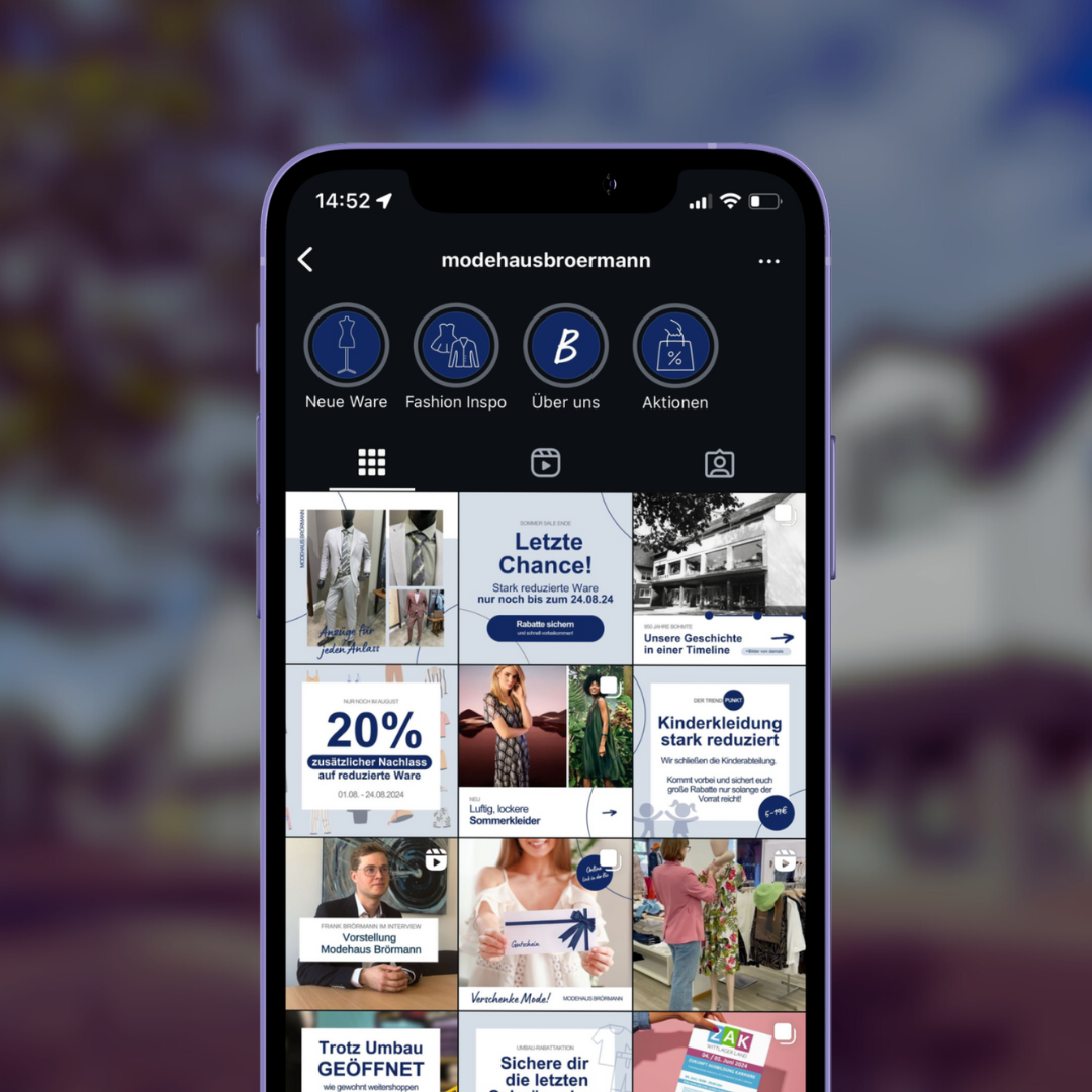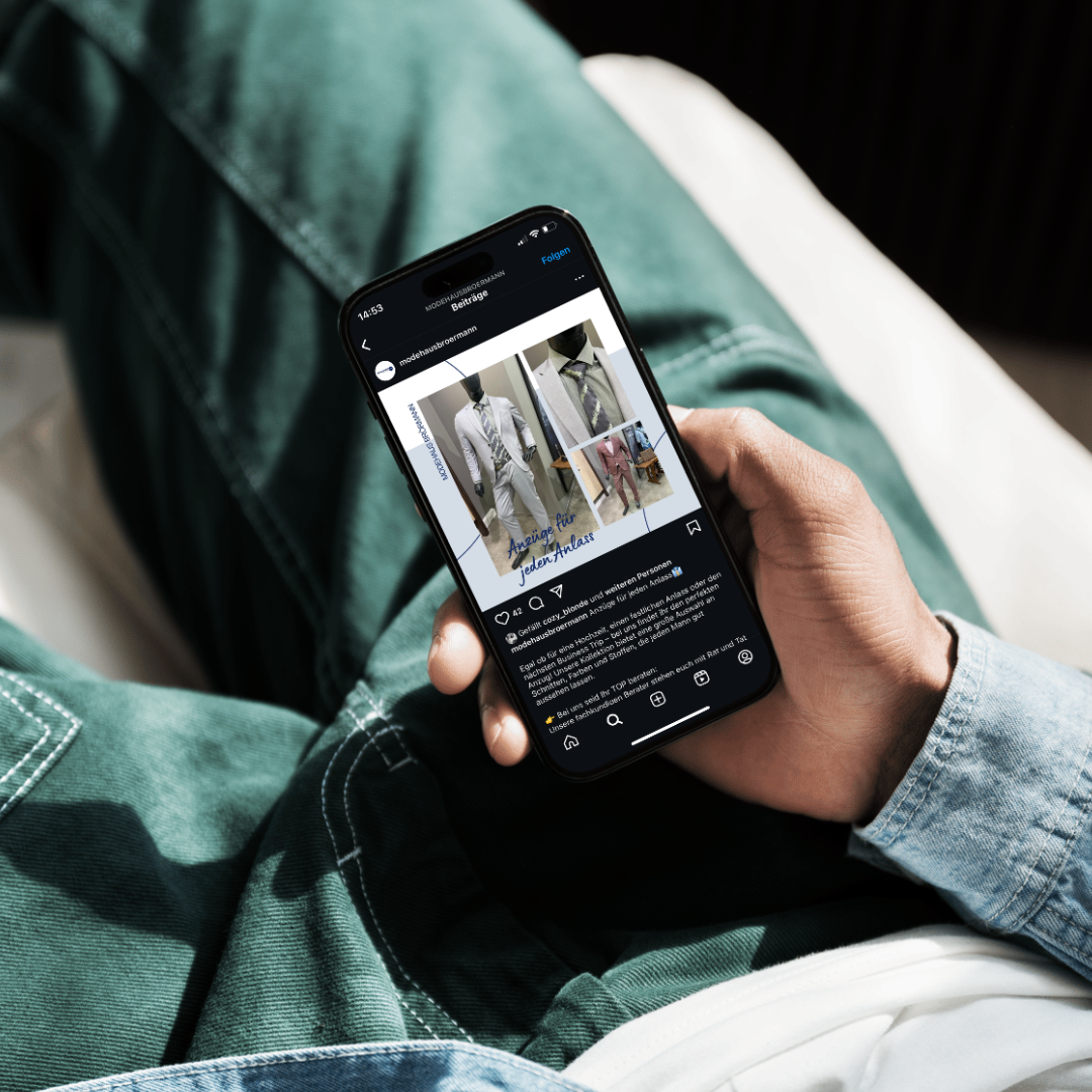 Das Modehaus Brörmann stand vor der Herausforderung, seine Social-Media-Präsenz auf Instagram und Facebook auszubauen, um potenzielle Kunden gezielt anzusprechen und über aktuelle Angebote zu informieren. Da die Webseite bereits erfolgreich umgesetzt war, lag der Fokus darauf, ein Social-Media-Design zu entwickeln, das optisch zur Webseite passt und somit einen Wiedererkennungswert über alle Kanäle schafft. Zudem war es wichtig, Inhalte zu erstellen, die sowohl informativ als auch ansprechend für die Zielgruppe sind.