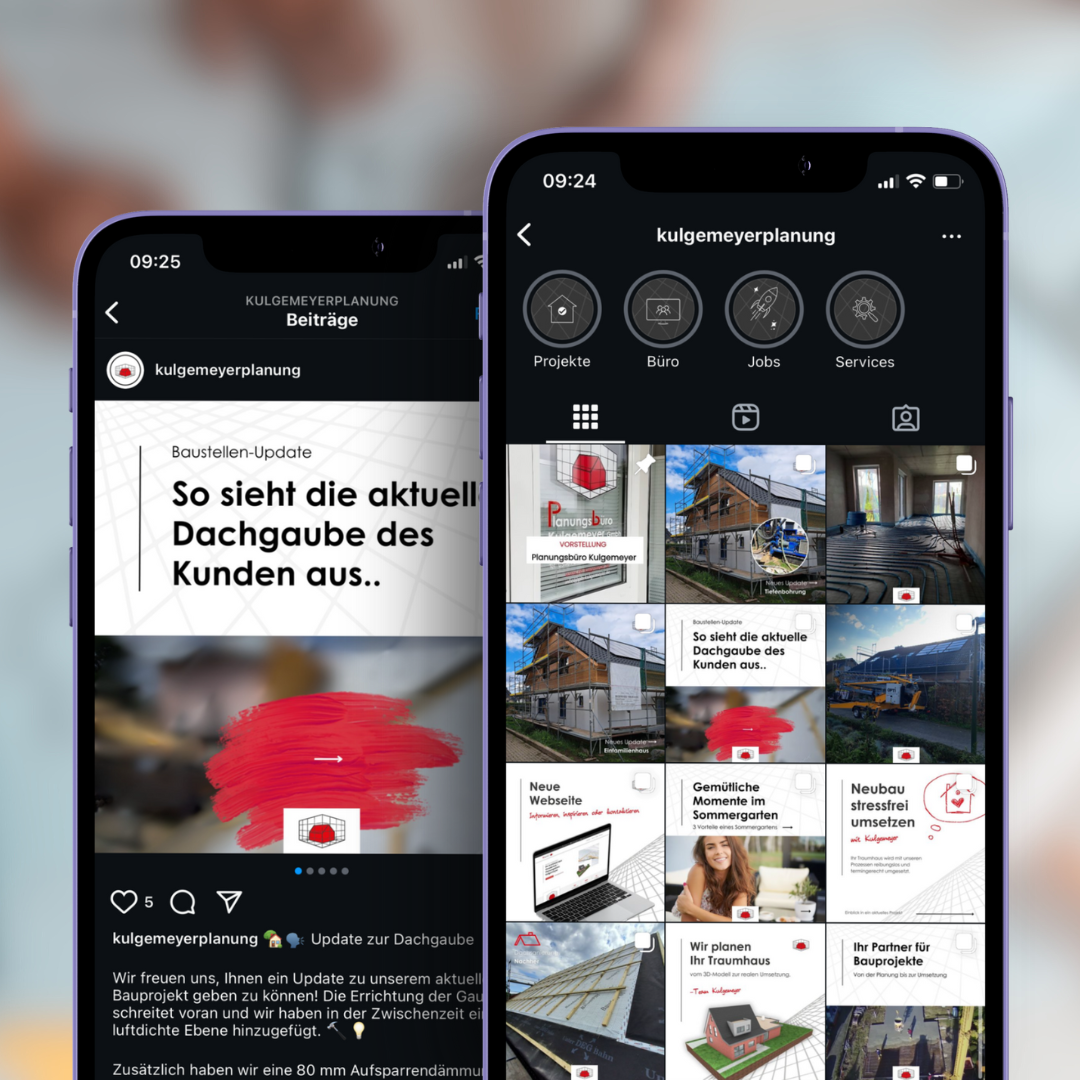 Zur Umsetzung des Projekts wurden neue Social-Media-Accounts für Instagram und Facebook erstellt, die das Corporate Design des Planungsbüros Kulgemeyer widerspiegeln. Dabei wurde besonders auf ein optisch ansprechendes Design geachtet, das sich nahtlos in das bestehende visuelle Konzept der Webseite einfügt. Motion Media unterstützte das Planungsbüro bei der Erstellung von Texten und Grafiken, die speziell auf die Zielgruppe zugeschnitten sind. Highlight-Icons wurden entwickelt, um wichtige Themenbereiche klar und strukturiert zu präsentieren und die Benutzerfreundlichkeit zu erhöhen.
