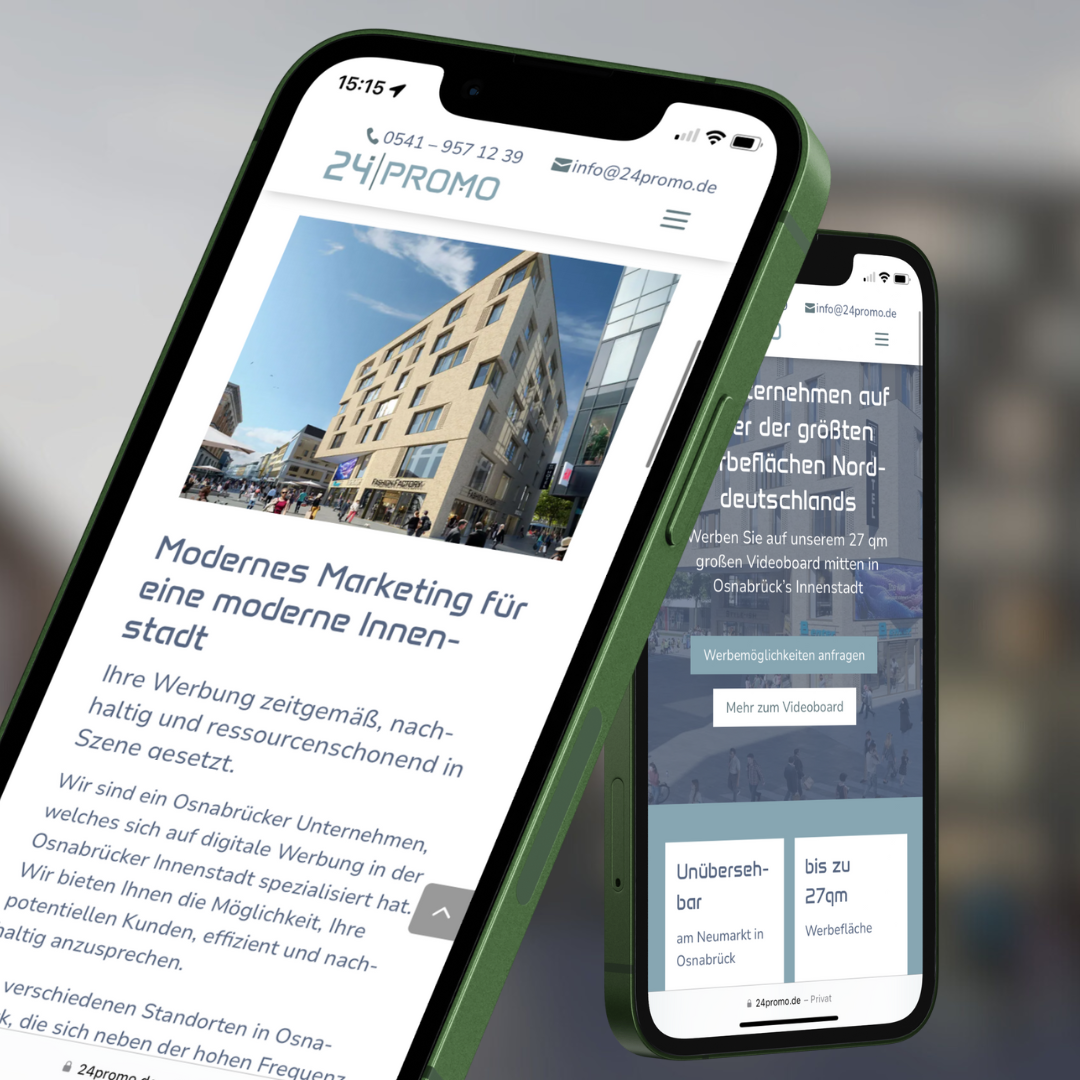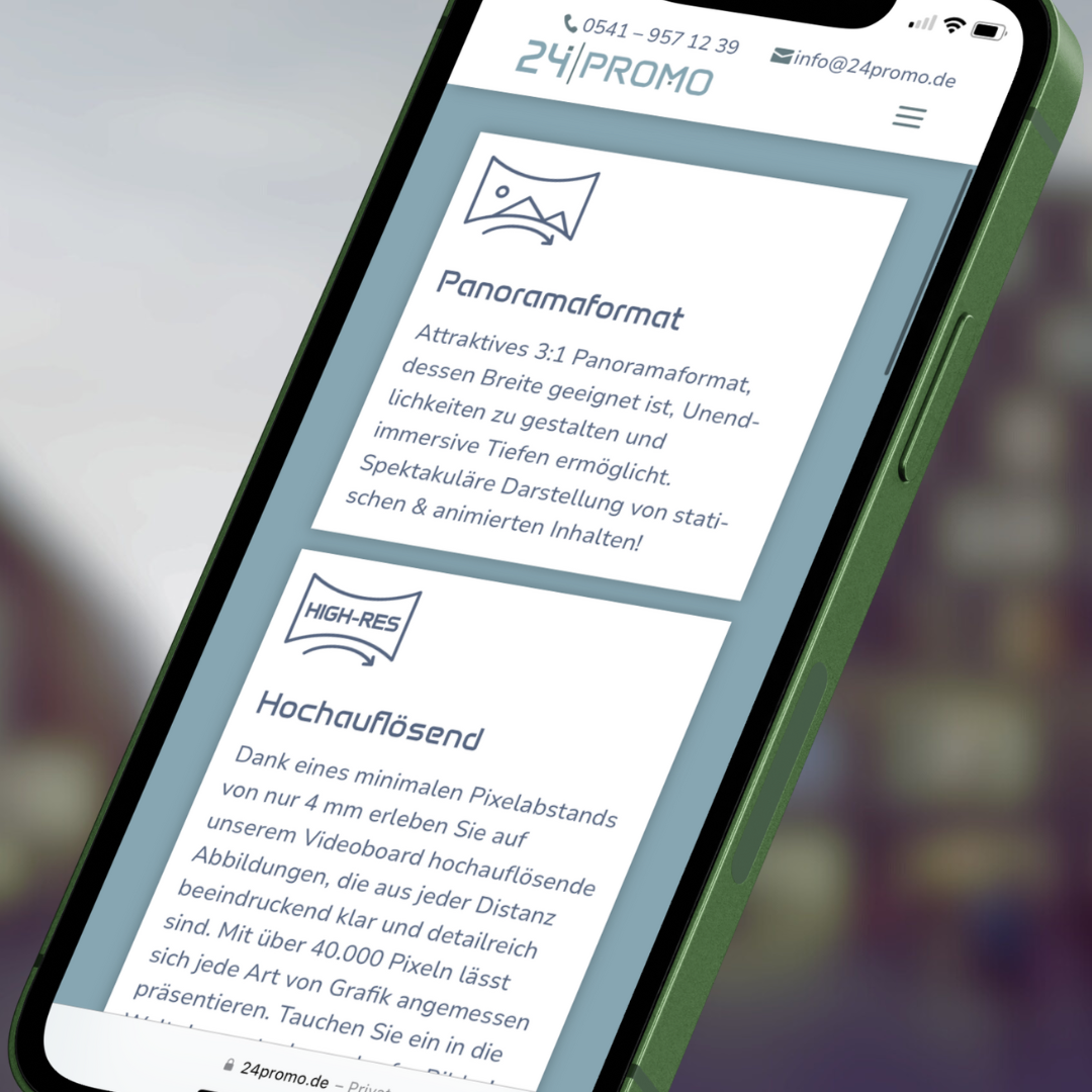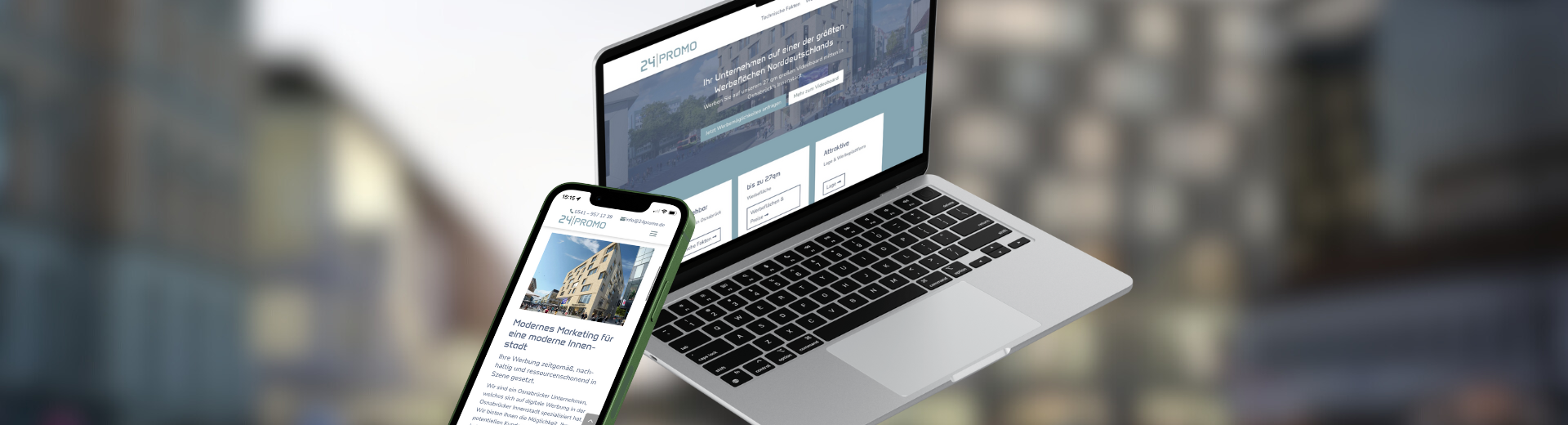 Die Anforderung an die Gestaltung der neuen Webseite für 24promo bestand darin, eine moderne, benutzerfreundliche und visuell ansprechende Online-Präsenz zu schaffen, die das Corporate Design des Unternehmens widerspiegelt. Die Webseite sollte in Blau- und Grautönen gestaltet werden und damit einen Wiedererkennungwert zum Mutterunternehmen, der dbi Immobiliengruppe, schaffen. Wichtig war es, ein responsives Design zu entwickeln, das auf allen Geräten optimal funktioniert. Darüber hinaus sollte die Webseite viele Bilder enthalten, die die Werbeflächen von 24promo zeigen, sowie eigene Icons, um die verschiedenen Dienstleistungen und Angebote klar und übersichtlich darzustellen.