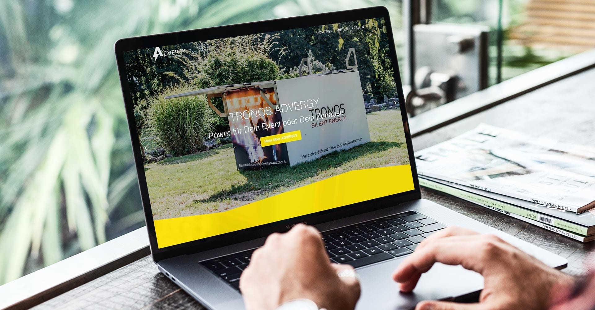 Bei der Webseite für Tronos Advergy steht das Produkt im Vordergrund – große Bilder und klar strukturierte Fakten zum Produkt überzeugen den Interessenten. Ein Counter im oberen Drittel der Startseite macht die wichtigsten Attribute des mobilen Solarkraftwerks auf den ersten Blick ersichtlich. Danach folgen weitere technische Daten in Tabellenform, die es dem Interessenten erlauben, diese schnell zu erfassen.