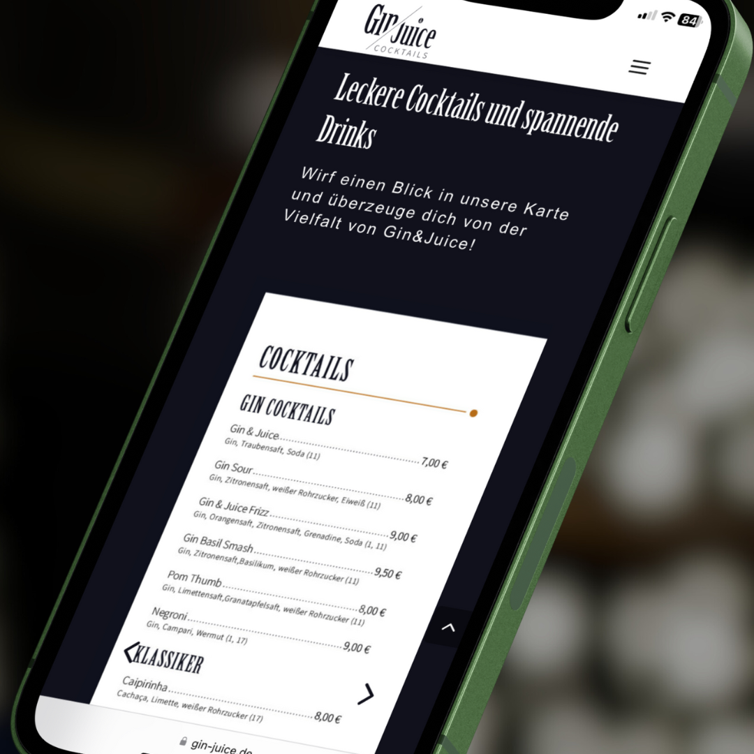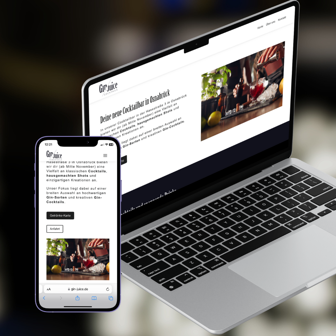 Die Eröffnung der Osnabrücker Cocktailbar „Gin & Juice“ brachte die Anforderung mit sich, eine ansprechende Online-Präsenz zu schaffen, die das moderne und zielgruppengerechte Erscheinungsbild der Bar widerspiegelt. Neben der Webseite sollte ein konsistentes Corporate Design entwickelt werden, das sich in allen Bereichen des Markenauftritts – von Printmedien bis hin zur Social-Media-Präsenz – wiederfindet.