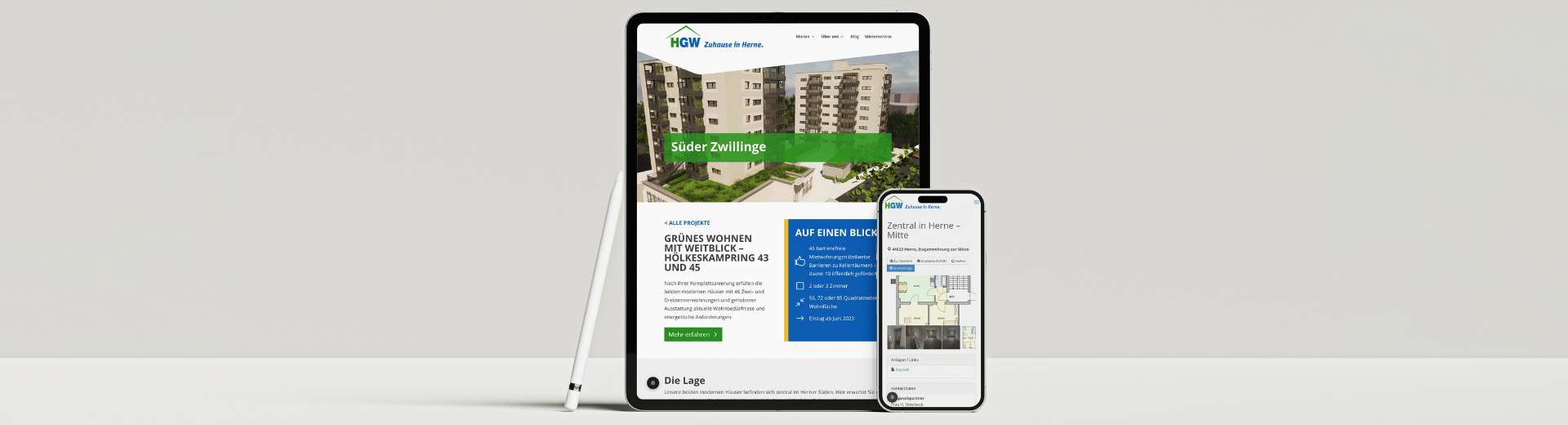 Das Ergebnis der Umgestaltung ist eine moderne und responsive Webseite, die auf allen Endgeräten einwandfrei funktioniert. Die neue Webseite von HGW Herne ist übersichtlich gestaltet und bietet den Besuchern einen schnellen Überblick über alle wichtigen Informationen. Wohnungsangebote sind leicht zugänglich und gut präsentiert, was die Suche nach passenden Immobilien vereinfacht. Der Mieterservice wurde durch die Integration von Formularen und zusätzlichen Serviceangeboten, wie einem Handwerkerservice, deutlich verbessert. Insgesamt stärkt die neue Webseite die Online-Präsenz von HGW Herne und bietet eine verbesserte Nutzererfahrung.