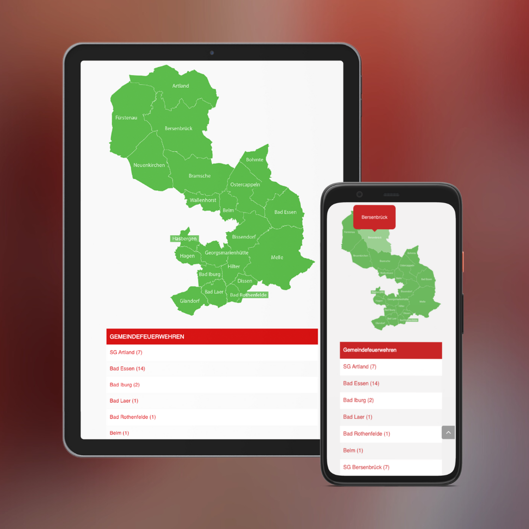 Darüber hinaus haben wir dynamische und interaktive Elemente umgesetzt, mit der Besucher interagieren können. Neuigkeiten in Form eines umfangreichen Blogs, eine Veranstaltungsübersicht mit individuellen Anzeigeoptionen und eine interaktive Karte für alle Gemeindefeuerwehren wurden umgesetzt.