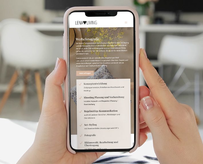 Als Lena Schreiber sich mit ihren Leidenschaften Werbefotografie und Interior- & Set-Styling selbstständig machte, traf sie die Entscheidung für eine Webseite mit Motion Media. Lena als Person, die als Bloggerin über 80.000 Follower auf Instagram hat, wollte sich und ihre Leistungen authentisch auf der Webseite präsentieren. Potentielle Kunden sollen sie und ihre Arbeit kennenlernen. Durch ihr großes Portfolio aus den verschiedenen Bereichen können Interessierte sich einen Überblick über ihre Arbeit verschaffen und ihren Stil kennenlernen.