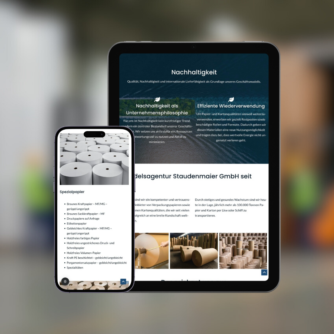 Die neue Webseite spiegelt die Professionalität und das nachhaltige Selbstverständnis der Handelsagentur Staudenmaier wider – aufgeräumt, benutzerfreundlich und technisch aktuell. Dank der OnePage-Struktur finden sich Nutzer:innen schnell zurecht und erhalten auf einen Blick alle relevanten Informationen. Die Seite ist nicht nur visuell ansprechend und mobil-optimiert, sondern erfüllt auch wichtige Anforderungen an Zugänglichkeit und Nutzerfreundlichkeit. Der neue Webauftritt stärkt die Positionierung der Marke als zuverlässiger, international agierender Partner in der Papierbranche.